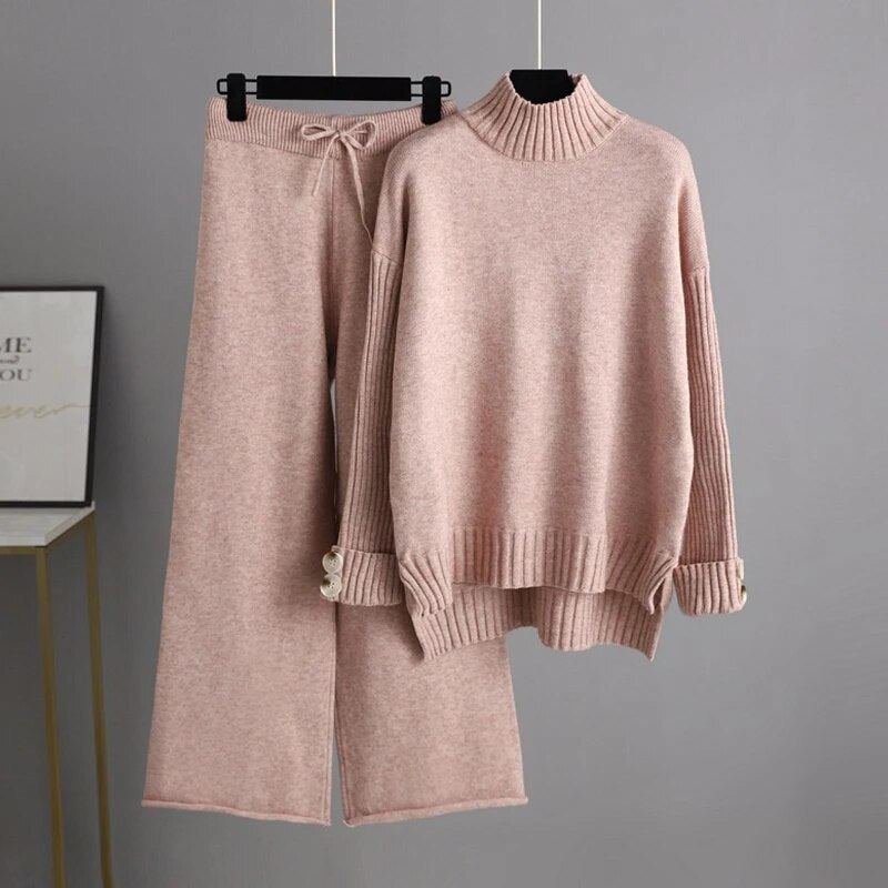 Avvolgiti nel comfort e nell’eleganza con questo esclusivo set due pezzi a collo alto, pensato per chi vuole sentirsi impeccabile senza rinunciare alla morbidezza. Il maglione, con collo alto avvolgente e lavorazione a coste su polsini e bordo, dona un tocco raffinato e moderno, mentre i bottoni decorativi sulle maniche aggiungono una nota chic e ricercata.